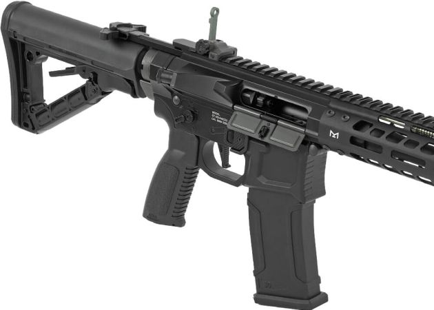 De handguard is rondom voorzien van M‑LOK sleuven, zodat je eenvoudig accessoires zoals een voorgreep, zaklamp of laser kunt monteren. Dit geeft je de vrijheid om de replica volledig naar jouw speelstijl aan te passen. Bovendien is de handguard ontworpen met gewicht‑reducerende sleuven, wat bijdraagt aan een goede balans en wendbaarheid tijdens snelle CQB‑situaties.